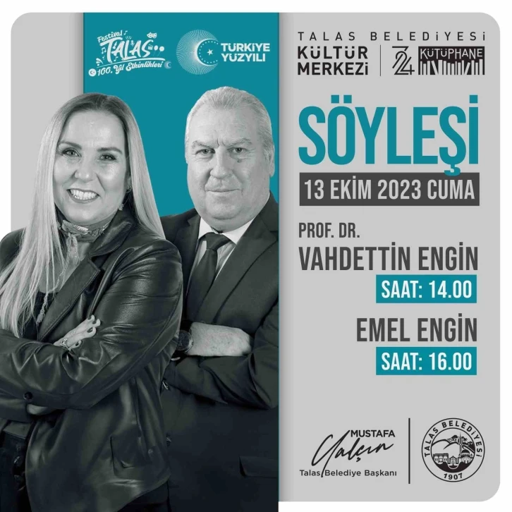 Araştırmacı, yazar ve akademisyenler, Talas Belediyesi tarafından düzenlenecek programla öğrencilerle buluşacak. Kente gelen araştırmacı ve akademisyenler, Talas 7/24 Kütüphane ve Kültür Merkezi’nde öğrencilerle bir araya gelecek. Festival Talas 100. Yıl Etkinlikleri çerçevesinde ilk olarak 13 Ekim Cuma günü Prof. Dr. Vahdettin Engin ve Tarihçi Yazar Emel Engin’in yer alacağı programda tarihseverlerin merak ettiği konular masaya yatırılacak. Saat 14.00’te Vahdettin Engin’in öğrencilerle buluşacağı programda 16.00’da da Emel Engin’in söyleşisi başlayacak. Devamı gelecek