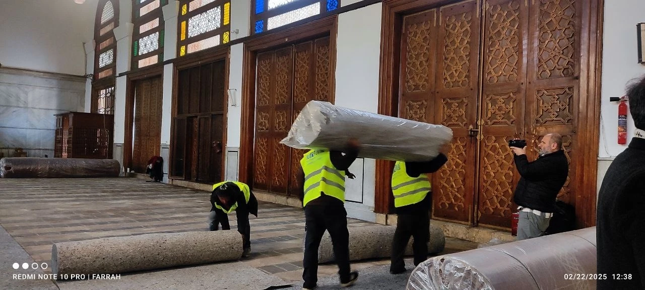 Suriye’nin başkenti Şam’daki Emevi Camii’nde Esad rejiminin ardından yenileme çalışmaları sürüyor. Ramazan ayına günler kala gerçekleştirilen hazırlıklar çerçevesinde tarihi camiye Cumhurbaşkanı Recep Tayyip Erdoğan’ın seçtiği ve Gaziantep’ten gönderilen bordo renkli yün halılar serilmeye başlandı.