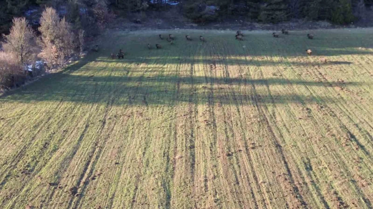 Karabük’ün Eflani ilçesinde tarlada yiyecek arayan domuz sürüsü dronla havadan görüntülendi.