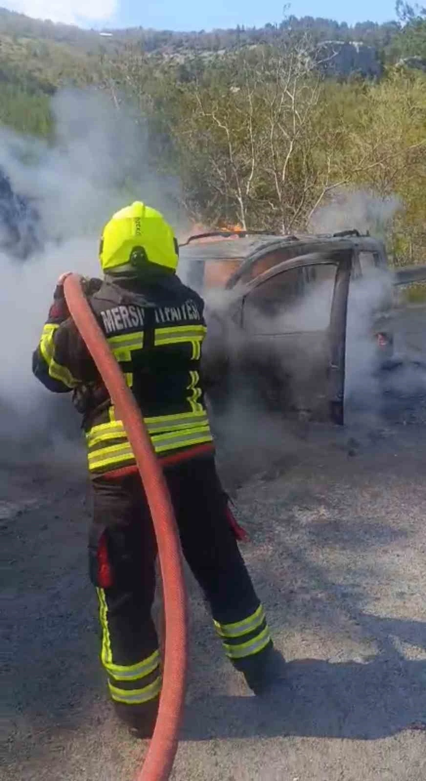 Alınan bilgiye göre, A.S.’nin sürücülüğünü yaptığı hafif ticari araç seyir halindeyken henüz bilinmeyen bir nedenle motor kısmından yanmaya başladı. Durumu fark eden sürücü aracı güvenlik şeridinde durdurdu. İhbar üzerine olay yerine intikal eden Mersin Büyükşehir Belediyesi itfaiye ekipleri müdahale ederek yangını söndürdü.