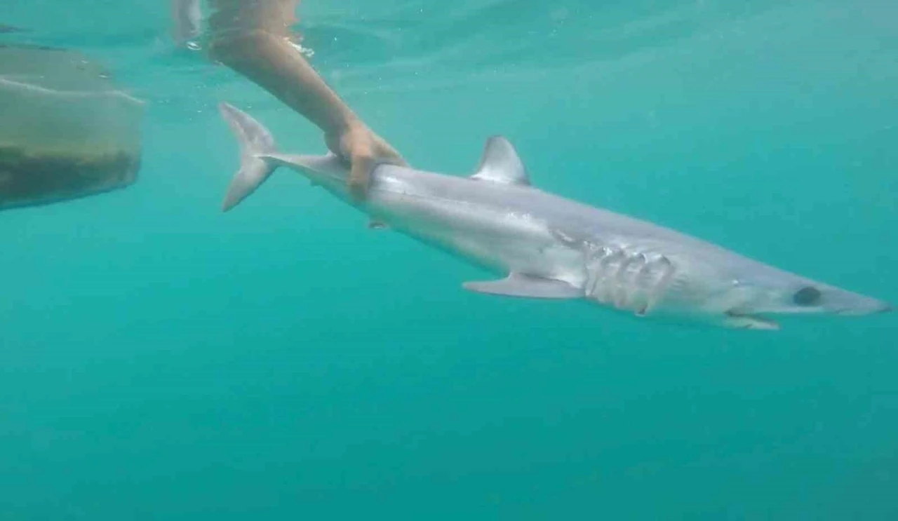 Mersin’de hobi olarak balık avlayan Çınar Küçük, geçen ay oltasına takılan yaklaşık 120 santimetre boyundaki Mako cinsi köpek balığını, yüzgecine takılan olta iğnesini çıkarıp bir süre eliyle tutarak yüzdürdükten sonra denize geri bırakmıştı.