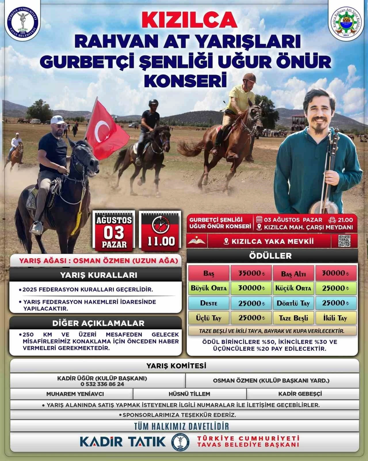 Tavas Belediyesi tarafından düzenlenecek olan Kızılca Rahvan At Yarışı ve Gurbetçi Festivaline sayılı günler kaldı. 3 Ağustos Pazar günü Kızılca Mahallesinde gerçekleştirilecek olan festivale Tavas Belediye Başkanı Kadir Tatık, tüm vatandaşları davet etti. Tavas Belediyesi tarafından düzenlenen Kızılca Rahvan At Yarışı ve gurbette yaşan Tavaslı vatandaşlar ile Tavas’ta yaşayan vatandaşların tanışıp kaynaşması amacıyla düzenlenen Gurbetçi Festivali 3 Ağustos Pazar günü Tavas’ın Kızılca Mahallesinde gerçekleştirilecek. Saat 11.00 da Kızılca Yaka Mevkiinde düzenlenecek olan rahvan yarışların ardından saat 21.00 da Kızılca Çarşı Meydanında Uğur Önür konseriyle keyifli ve unutulmaz gece yaşanacak. Tüm vatandaşları konsere davet eden Tavas Belediye Başkanı Kadir Tatık, "Rahvan atların nefes kesen mücadelesi, gurbetçilerimizle buluşma heyecanı ve Uğur Önür konseriyle dolu dolu bir gün vatandaşlarımızı bekliyor. 3 Ağustos günü herkesi Kızılca Mahallemize davet ediyorum" dedi.