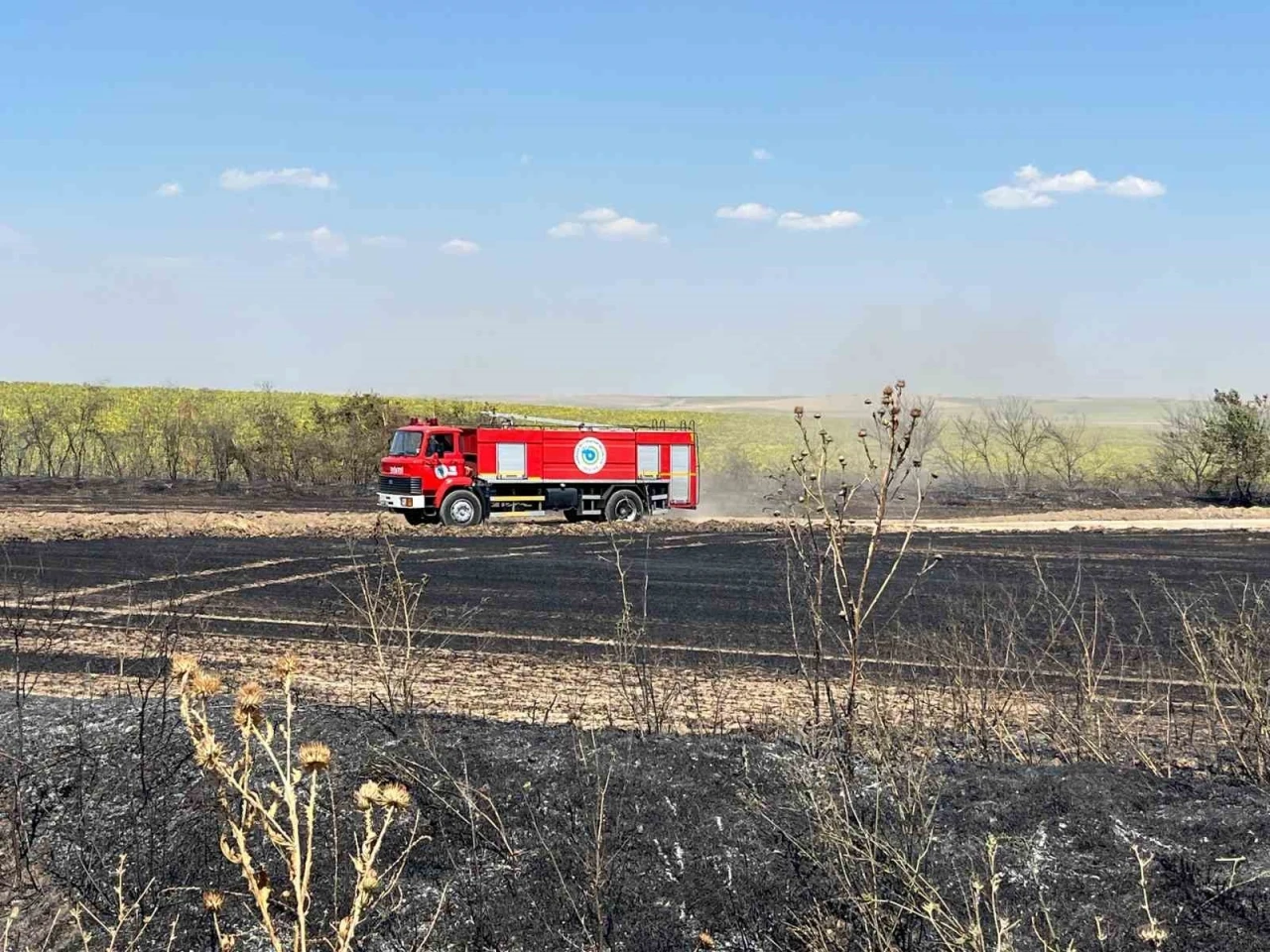 İtfaiye ekipleri ve çiftçilerin de traktörlerle yardım ettiği yangın, yaklaşık iki saat süren yoğun çabanın ardından kontrol altına alındı.