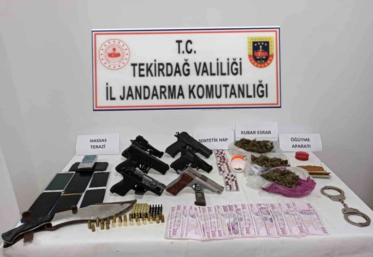Tekirdağ İl Jandarma Komutanlığı’nın istihbari çalışmaları sonucu Süleymanpaşa ilçesi Altınova ve Çiftlikönü Mahallelerinde yapılan operasyonda S.A. isimli şahsın ikamet adreslerinde çeşitli silahlar, uyuşturucu madde ve suç eşyaları ele geçirildi. Yapılan aramalarda bir kişi gözaltına alındı.