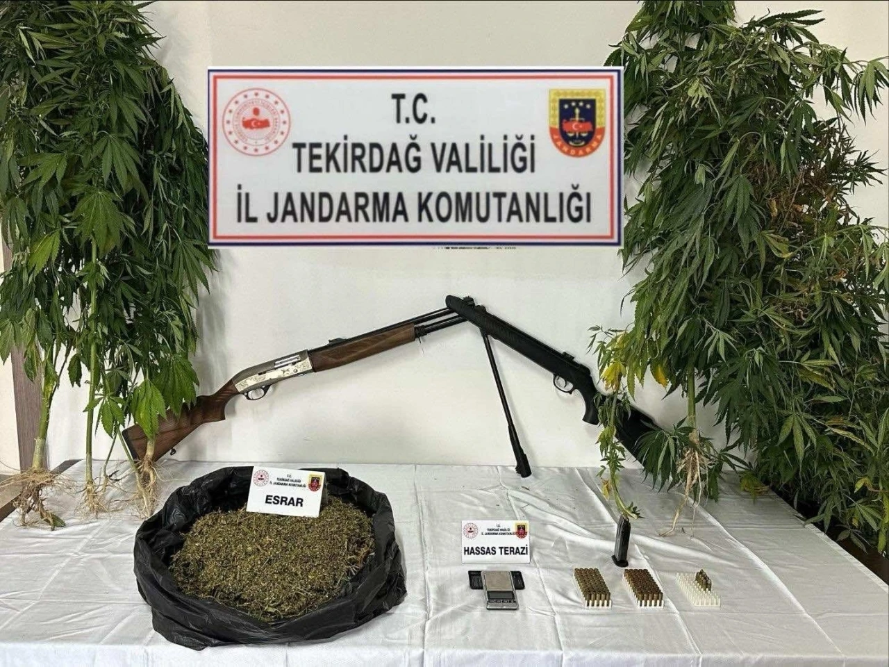 Ergene ilçesi Velimeşe Mahallesi’nde F.A.’ya ait ikamet ve eklentilerinde gerçekleştirilen aramada da, 15 kök kenevir bitkisi, bin 33 gram kubar esrar, 1 adet hassas terazi, 2 adet av tüfeği, 1 adet tabanca şarjörü ve 123 adet tabanca fişeği bulundu.