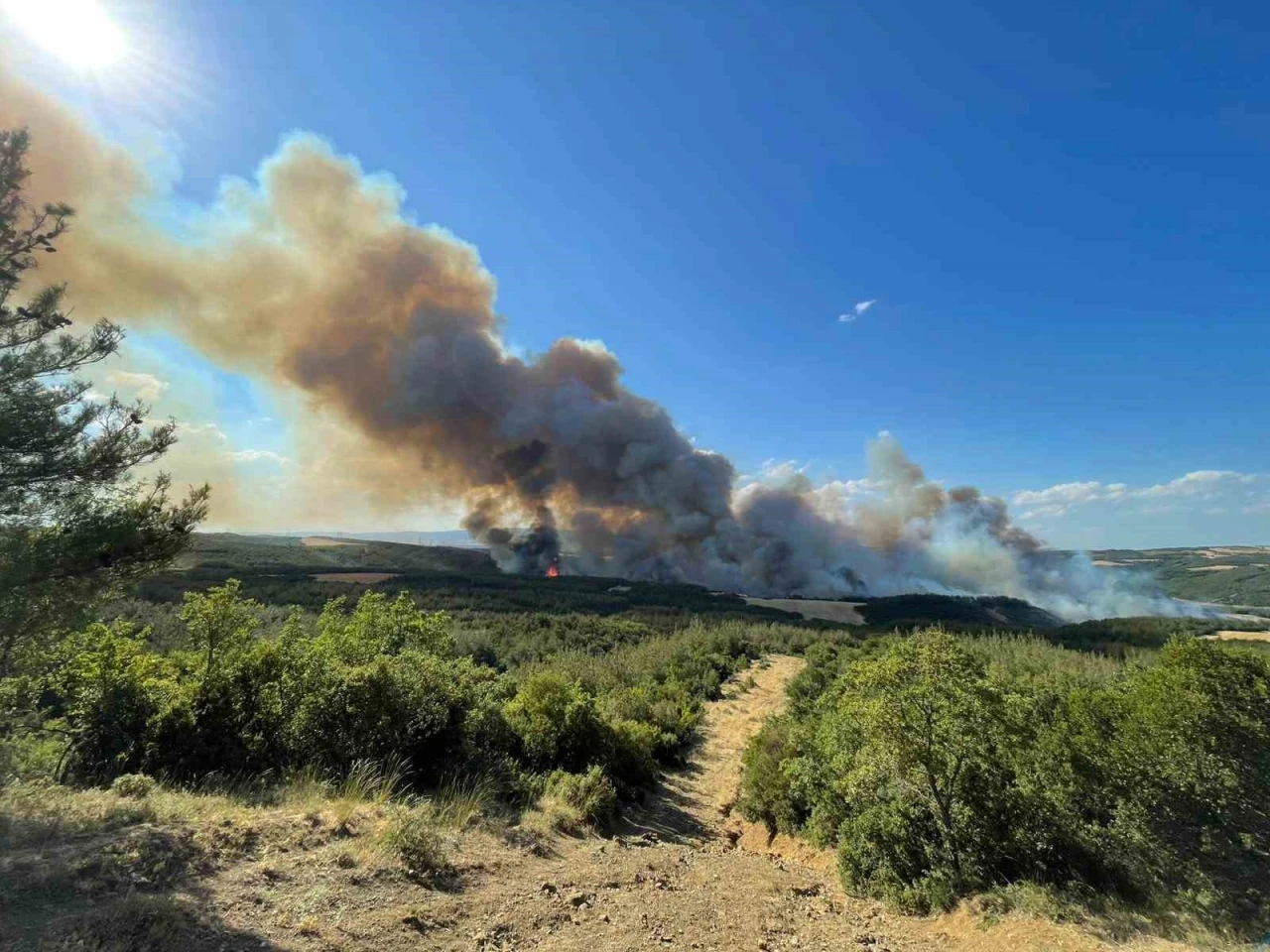 Şarköy’e bağlı Sofuköy Mahallesi kırsalında henüz belirlenemeyen bir nedenle ormanlık alanda yangın çıktı. Alevleri fark eden vatandaşların ihbarı üzerine bölgeye çok sayıda ekip sevk edildi. Yangına Orman Genel Müdürlüğü’ne bağlı bir yangın söndürme uçağı, helikopter, arazözler ve itfaiye ekipleri tarafından müdahale başlatıldı. Rüzgarın da etkisiyle yayılan alevlerin kontrol altına alınması için çalışmalar yoğun şekilde sürüyor. Ekipler, yangının yerleşim yerlerine sıçramaması için büyük çaba sarf ederken, bazı tarım alanlarının da yangından etkilendiği öğrenildi. Bölgeye giden jandarma ekipleri ise çevrede güvenlik önlemi aldı.