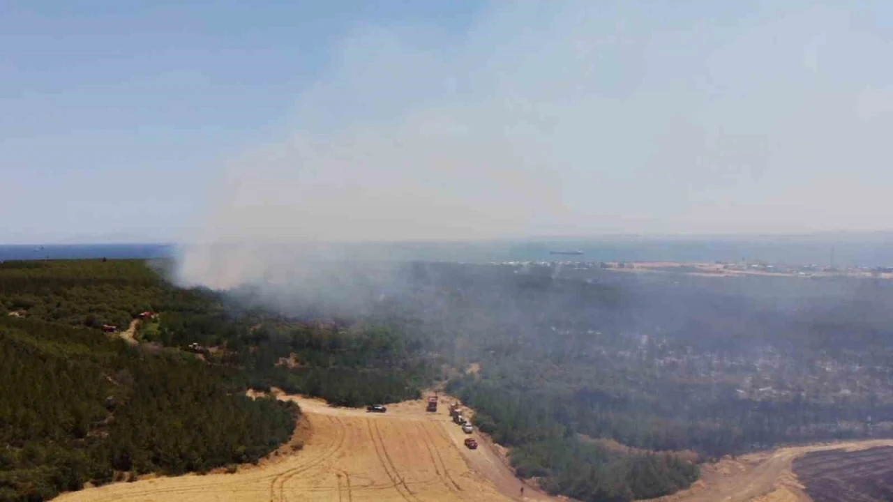 Tekirdağ’ın Şarköy ilçesine bağlı Kızılcaterzi Mahallesi yakınlarındaki ormanlık alanda çıkan yangın kontrol altına alınmaya çalışılıyor.