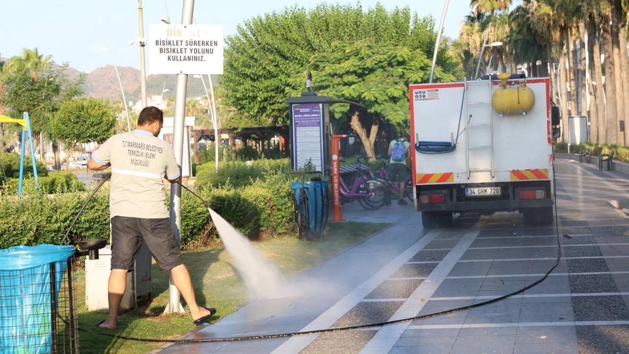 Marmaris Belediyesi Temizlik İşleri Müdürlüğü, turizm sezonunun yoğunlaştığı bu dönemde sıkı bir tempoyla çalışıyor. Günlük yapılan rutin temizlik dışında, sorumluluk sahası dışında kalmasına rağmen pek çok noktada çalışmalarını sürdüren ekipler, Marmaris’i temiz tutmak için 7/24 mesai harcıyor.