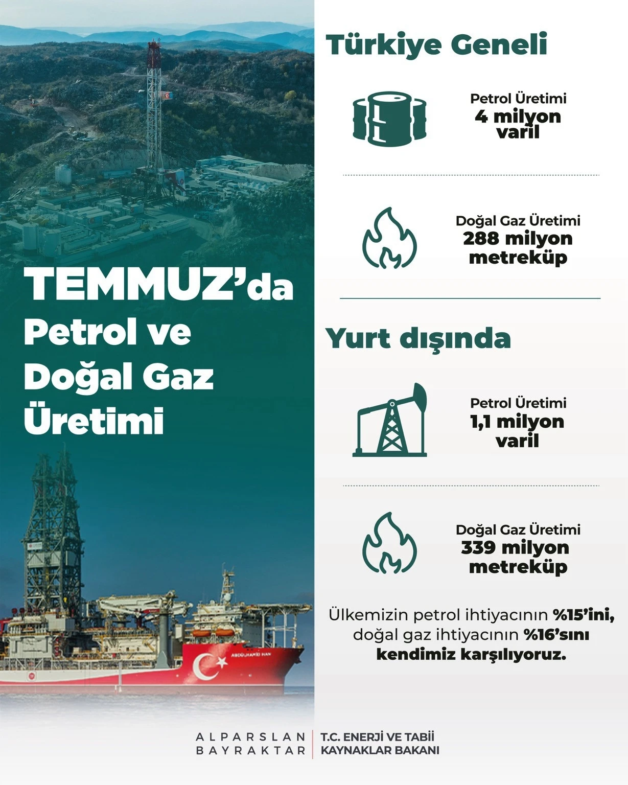 Yurt dışındaki petrol ve doğal gaz üretiminin de önemli bir boyuta ulaştığını belirten Bakan Bayraktar, yurt dışında aylık 339 milyon metreküp doğal gaz, 1,1 milyon varil petrol üretimi gerçekleştirildiğini açıkladı. Bayraktar, "Yurt içi ve yurt dışı operasyonlarımız sayesinde ülkemizin petrol ihtiyacının yüzde 15’ini, doğal gaz ihtiyacının ise yüzde 16’sını kendimiz karşılıyoruz" bilgisini verdi.