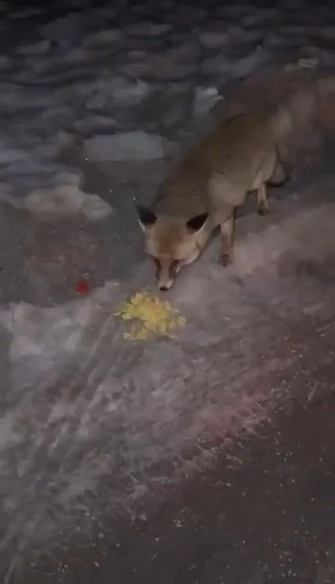 Uludağ’ın zirvesinden dönüşe geçen bir vatandaş, çöplerde tilkinin yiyecek aradığını gördü. Otomobilini kenarı çeken vatandaş, yanında sadece yiyecek olarak bulunan cipsi, tilki ile paylaştı. Kendisine ikram edilen cipsi geri çevirmeyen tilki, afiyetle bütün paketi midesine indirdi.