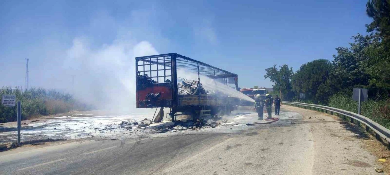 Edinilen bilgiye göre, Mustafa G. (66) idaresindekiAEK 876plakalı çekici ve26 ABR 337plakalı karton yüklü dorsesinden dumanlar yükselmeye başladı. Yoldaki diğer sürücülerin de uyarısıyla Mustafa G., tırı yolun kenarına çekti. Biranda alev topuna dönen dorse tamamen kül olurken, Karacabey Belediyesi İtfaiye ekipleri müdahale etti.