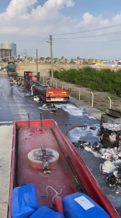 Mersin’in Tarsus ilçesinde park halindeki tırın üzerinde bulunan geri dönüşüm ürünleri yandı.