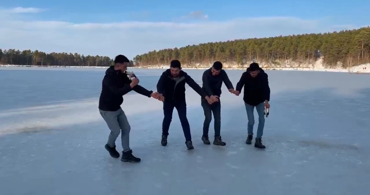 Yüzeyi buz tutan Kurt Gölü’nün üstüne çıkan gençler, horon oynayarak soğuk havayı eğlenceye dönüştürdü.