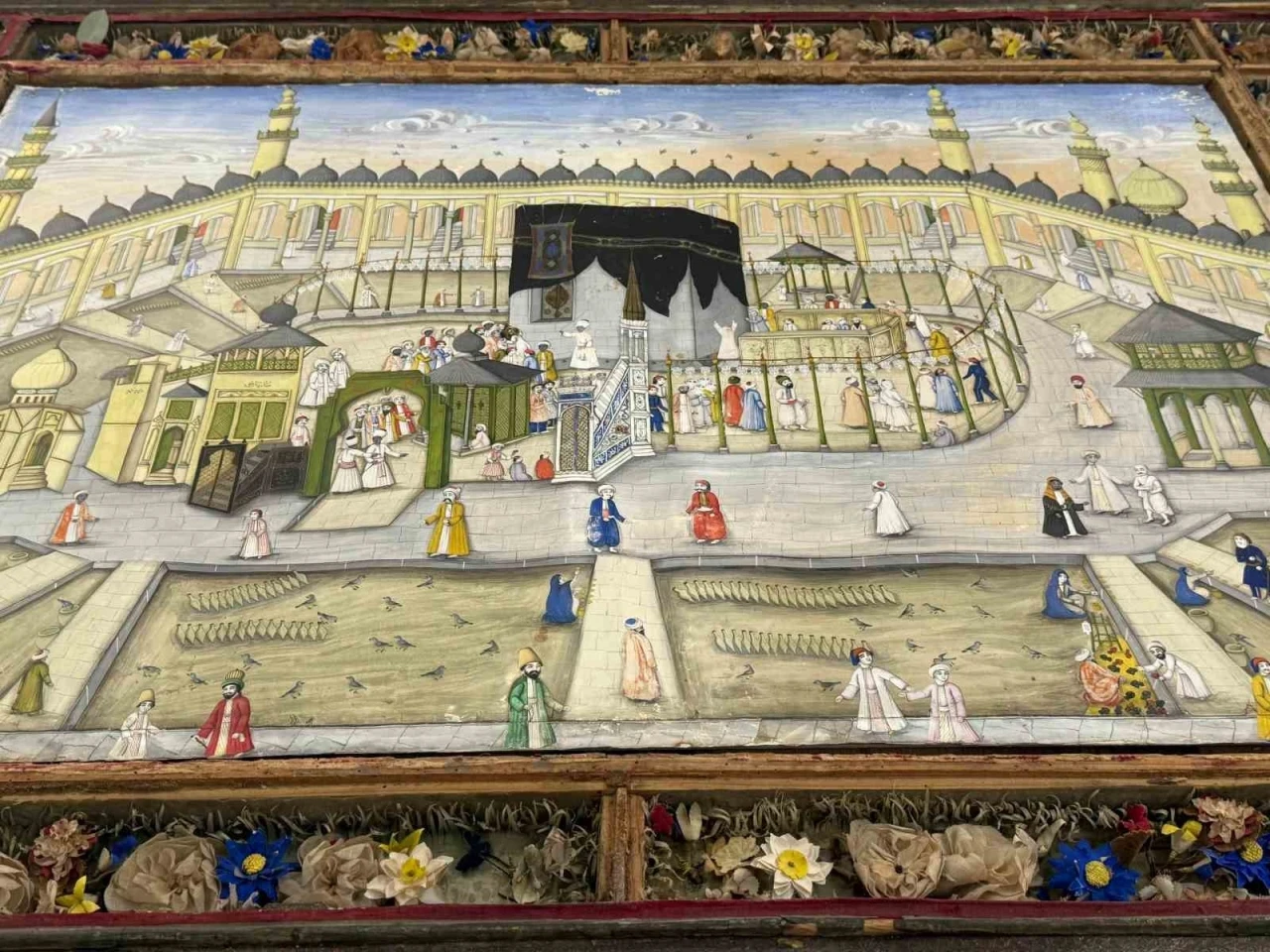 Klasik Türk sanatlarından minyatür temelli tabloda; Kabe’yi tavaf edenler, ihramlı erkekler, kadın figürleri, zemzem kuyuları ve testileri ayrıca üniformalı Osmanlı askerlerin betimlendiği görülüyor. Tabloda ayrıca Makam-ı İbrahim, Hicr-i İsmail ve Mimar Sinan’ın imzasını taşıyan revaklar gibi kutsal yapılar da yer alıyor. Bazı yapıların günümüzde varlığını yitirmiş olması, esere tarihsel bir derinlik katıyor. Çizimlerdeki titizlik, dönemin mimari ve sosyal yapısına dair ayrıntılı bilgi veriyor. Tablo kadar çerçevesi de sanat eseri