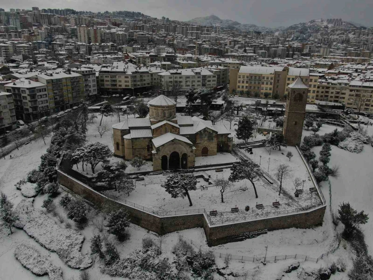 Trabzon’da etkili olan kar yağışıyla kent merkezi beyaza büründü. Görsel şölenin oluştuğu şehir havadan görüntülenirken, kardan kapanan 214 mahalle yolunun açılması için çalışmalar sürüyor.