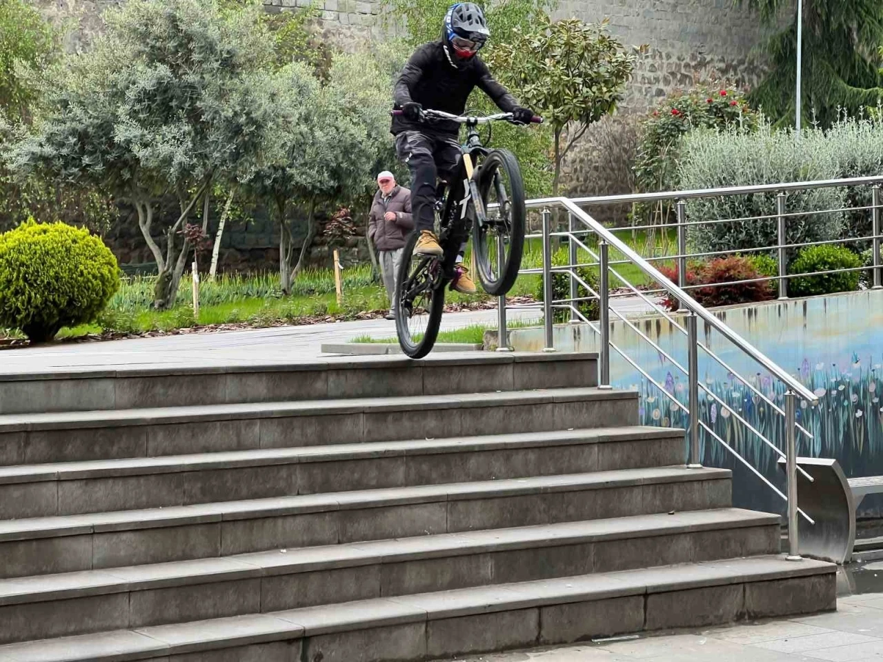 Trabzonlu genç yetenek Samet Demirbaş, kendi tasarladığı bisikletiyle dik merdivenlerden inişleriyle dikkat çekiyor. Dik merdivenlerden atlayarak adrenalin dolu gösteriler yapan Demirbaş, kısa sürede binlerce takipçiye ulaştı.