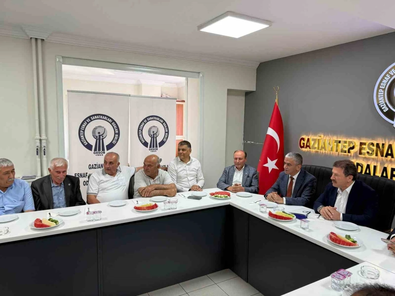 TŞOF Yönetim Kurulu Üyesi ve Gaziantep Esnaf ve Sanatkarlar Odaları Birliği (GESOB) Başkanı İsmet Özcan’ın ev sahipliğinde düzenlenen toplantıya, ESOB yöneticiler, merkez ve ilçe esnaf odası başkanları katıldı.