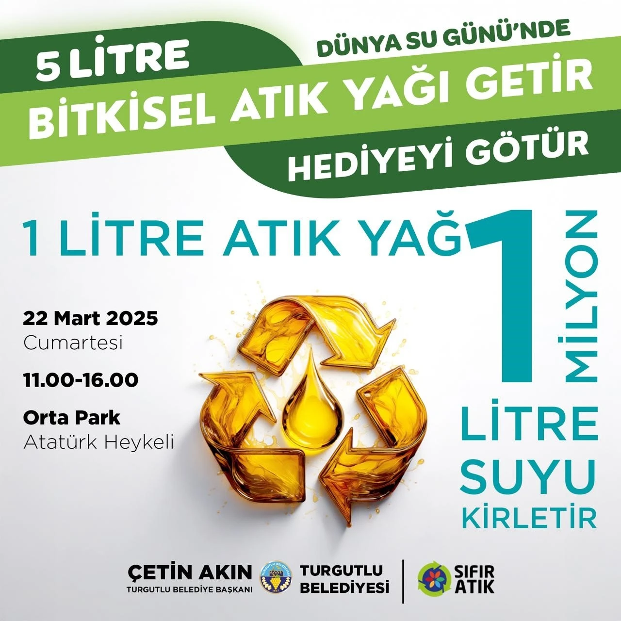 Turgutlu Belediyesi, Dünya Su Günü kapsamında çevre bilincini artırmaya yönelik önemli bir kampanya başlatıyor. 22 Mart Cumartesi günü saat 11.00-16.00 saatleri arasında Orta Park Atatürk Heykeli önünde gerçekleştirilecek olan "5 Litre Bitkisel Atık Yağını Getir Hediyeyi Götür" etkinliği ile atık yağlar doğaya zarar vermeden toplanacak. Kampanya kapsamında, 5 litre atık yağ getiren vatandaşlara çeşitli hediyeler verilecek.