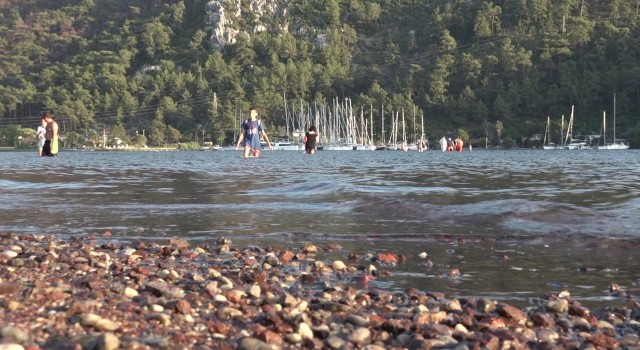 Marmaris’teki adı efsaneyle anılan dünyaca ünlü Kızkumu Plajı, yerli yabancı turistlerin uğrak mekanı haline geldi. Denizin üzerine adeta yürüyormuş hissi veren Kızkumu’na gelen turistler, deniz ve manzaranın keyfini çıkardı.