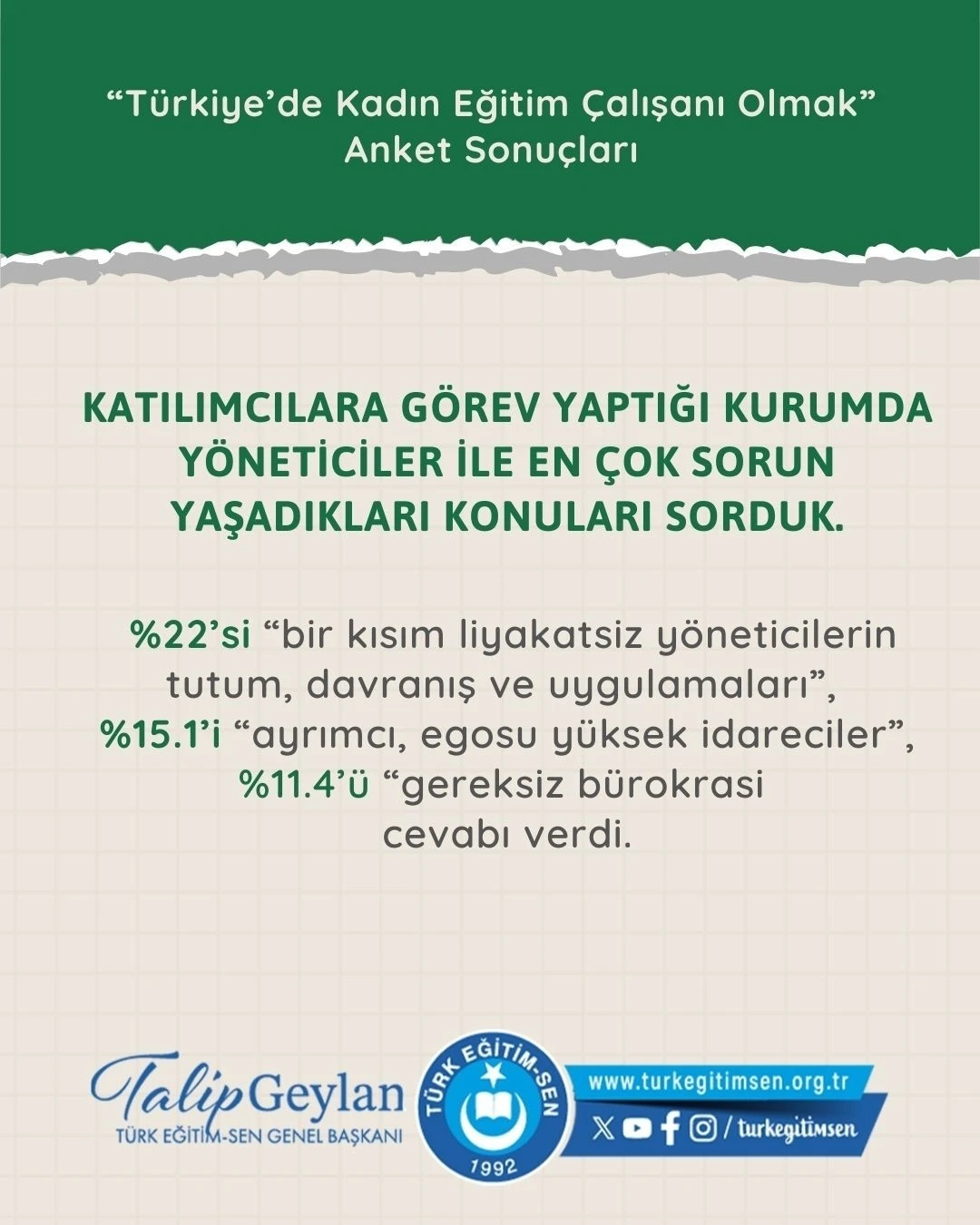 Ankette, kadın eğitim çalışanlarının, okul yöneticileriyle adil ve şeffaf olmayan yönetim anlayışı nedeniyle sıkıntı yaşadığını belirten Geylan, bunun çözümünün eğitim yöneticilerinin liyakat esasına göre atanması olduğuna dikkat çekti.