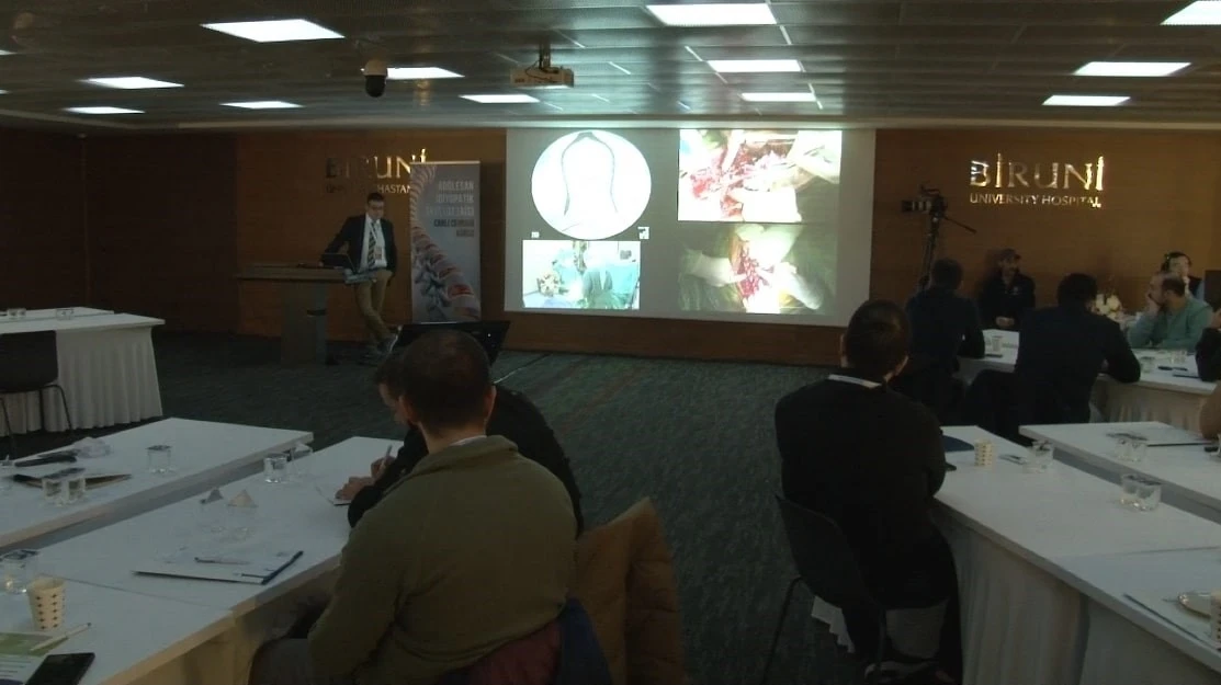 Biruni Üniversitesi Tıp Fakültesi Hastanesi’nde Ortopedi ve Travmatoloji Ana Bilim Dalı Omurga Sağlığı Merkezi tarafından 10-11 Ocak tarihlerinde Adölesan İdiyopatik Skolyoz canlı cerrahi kursu düzenlendi. Güncel bilimsel ve teknolojik gelişmelerin katılımcı doktorlara sunumlarla aktarıldığı kursta, gerçek zamanlı yapılan cerrahi operasyon ile vaka bazlı öğrenim imkanı sunuldu. Cerrahi operasyonu gerçekleştiren doktorlar, katılımcı doktorların sorularına anlık olarak yanıt verme imkanı buldu. “Amaç, toplumun bu cerrahiye ulaşılabilirliğini artırmak”