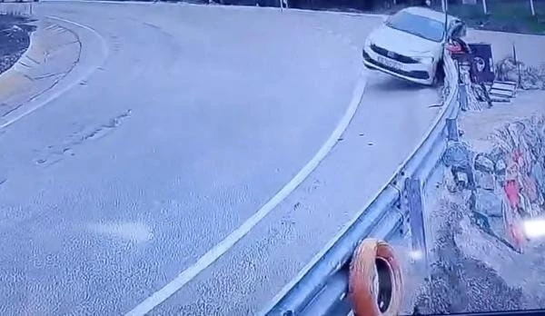 Uludağ yolundan şehir merkezine seyreden bir otomobil virajı alamayarak bariyerlere çarptı. O anlar güvenlik kamerasına yansıdı.