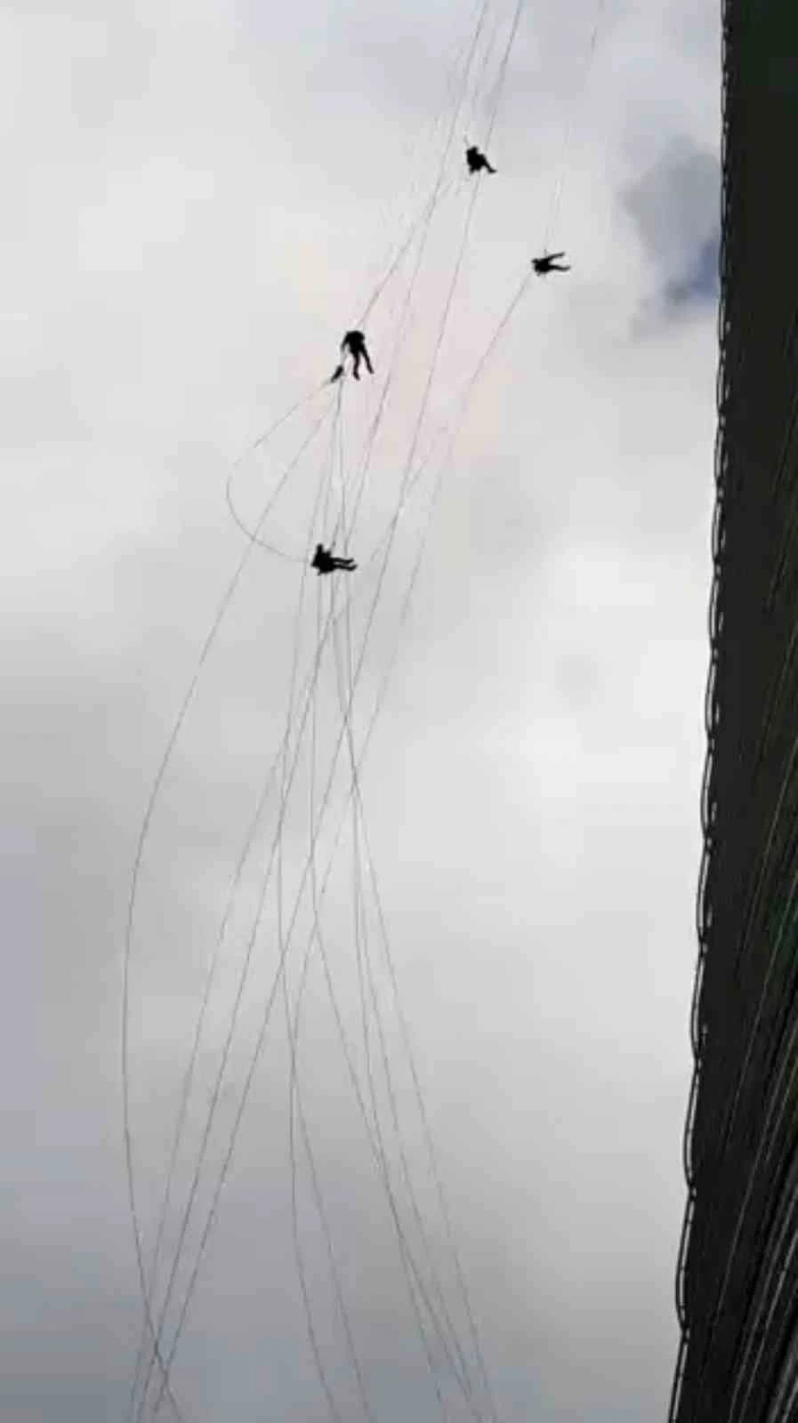 Olay, Ümraniye’deki Finans merkezinde meydana geldi. Edinilen bilgiye göre, sabah saatlerinde gökdelenin camlarını temizlemek için halatlarla binaya çıkan temizlik işçileri, aniden şiddetini artıran rüzgarın etkisinde kaldı. Metrelerce yüksekte savrulan işçiler, yaklaşık 2 buçuk saat boyunca binadan inmeye çalıştı. Halatlara sıkıca tutunarak denge sağlamaya çalışan işçilerin yaşadığı panik dolu anlar çevredeki vatandaşlar tarafından cep telefonu kamerasıyla kaydedildi.