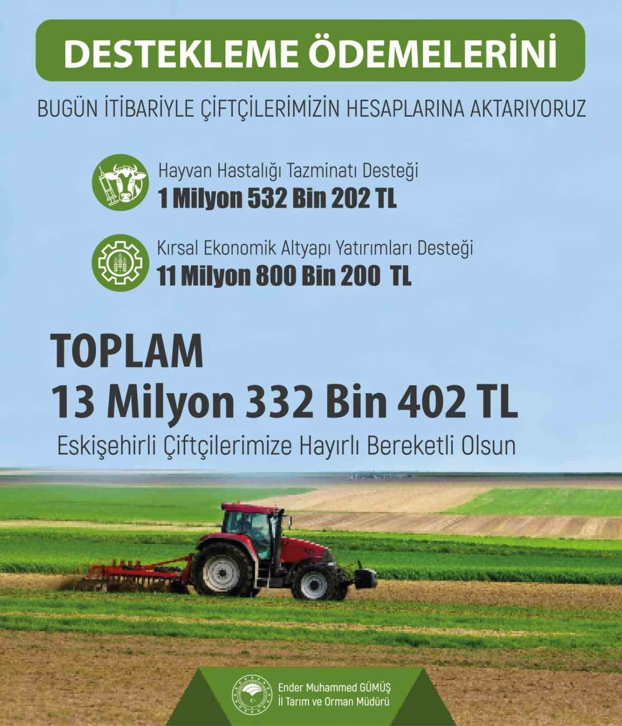 Eskişehir İl Tarım ve Orman Müdürlüğü, toplamda 17 üreticiye 13 milyon 332 bin 402 TL hibe ödemesi yapıldığını açıkladı.