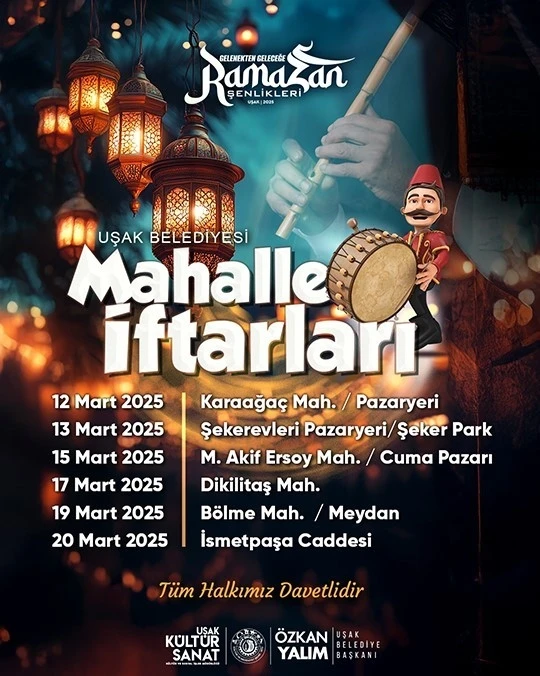Uşak Belediyesi’nce düzenlenen ‘Mahalle İftarları’ 12 Mart itibariyle Karaağaç Mahallesi’nde başlıyor. Uşak Belediyesi’nce düzenlenen Mahalle İftarları 12 Mart itibariyle Karaağaç Mahallesi’nde bulunan pazaryerinde başlıyor. Mahalle iftarları kapsamında 13 Mart günü Atatürk Mahallesi’nde bulunan Şekerevleri pazaryerinde, 15 Mart günü Mehmet Akif Ersoy Mahallesi’nde bulunan pazaryerinde, 17 Mart Dikilitaş Mahallesi’nde, 19 Mart Bölme Mahallesi meydanında ve 20 Mart günü ise İsmetpaşa Caddesi’nde yapılacak. Öte yandan, sosyal medya üzerinden yapılan paylaşımda ise Ramazan’ın bereketini ve birlikteliğini hep birlikte yaşamak için tüm vatandaşlar Mahalle iftarlarına davet edildi.