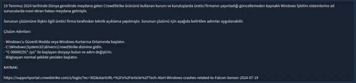 Dünya genelinde birçok kurumun ve firmanın etkilendiği internet sorunu ve siber aksaklık için çalışma yürüten USOM, sorunun siber saldırı kaynaklı olmadığını bildirdi. Konuya ilişkin yapılan açıklamada, “Windows işletim sistemi kullanan cihazlarda global çapta meydana gelen kesintiye ilişkin yapılan inceleme neticesinde yaşanan aksaklığın siber saldırı kaynaklı olmadığı tespiti yapılmıştır. Söz konusu kesintinin CrowdStrike ürününü kullanan kurum ve kuruluşlarda meydana geldiği tespit edilmekle birlikte, çözüm önerileri SİP üzerinden tüm SOME’lerimiz ile paylaşılmıştır. Ülkemizin siber sınırlarını korumak için yerli ve milli ürünlerimizle 7 gün 24 saat aralıksız çalışmaya devam ediyoruz” denildi.
