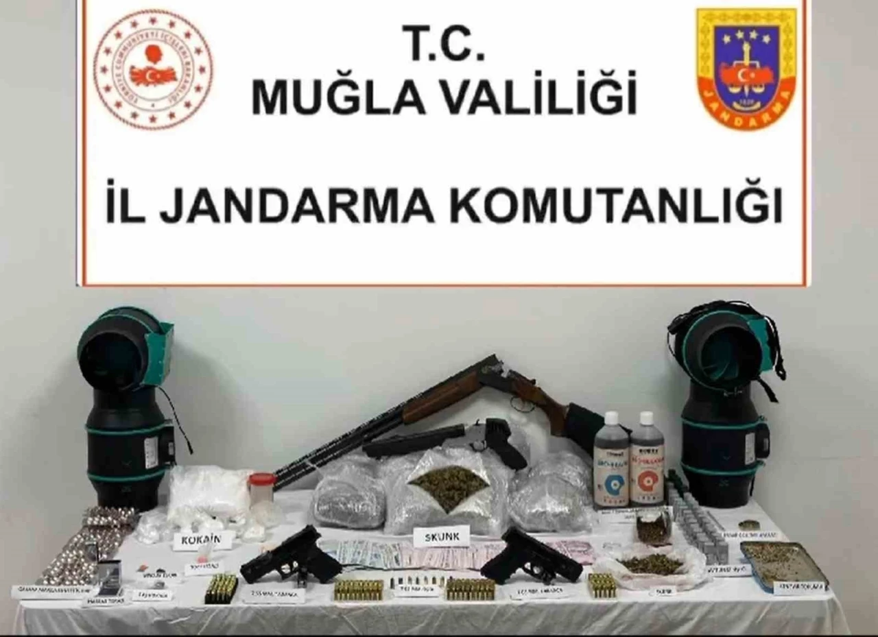 Muğla İl Jandarma Komutanlığı’nın gerçekleştirdiği başarılı istihbari çalışmalar sonucu, Fethiye ilçesinde uyuşturucu madde imal ve ticareti yaptığı değerlendirilen 2 kişi yakalandı. Yapılan aramalarda, 5 kilogram Skunk uyuşturucu madde, 2 kilogram kokain, 95 adet sentetik hap ve çok sayıda uyuşturucu kullanım malzemesi ele geçirildi. Ayrıca, ruhsatsız tabanca ve av tüfeği ile çeşitli silahlar da bulundu.