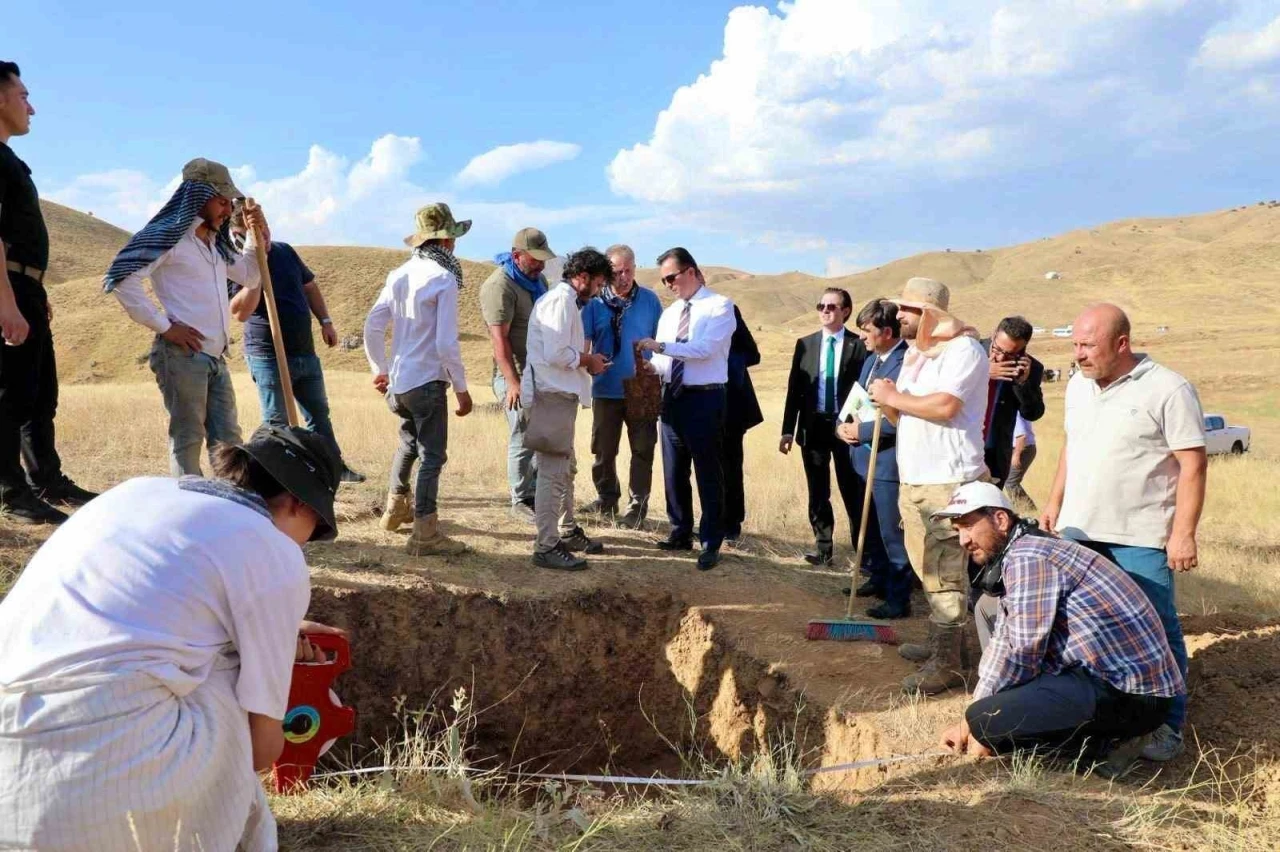 1916 yılında Çanakkale’den gelen bir taburun şehit edildiği ve toplu olarak defnedildiği değerlendirilen Karçınbaşı mevkiinde kazı çalışmaları sürüyor. Beraberindekilerle birlikte alandaki kazı çalışmalarını inceleyen Vali Ahmet Karakaya, yetkililerden bilgi aldı.