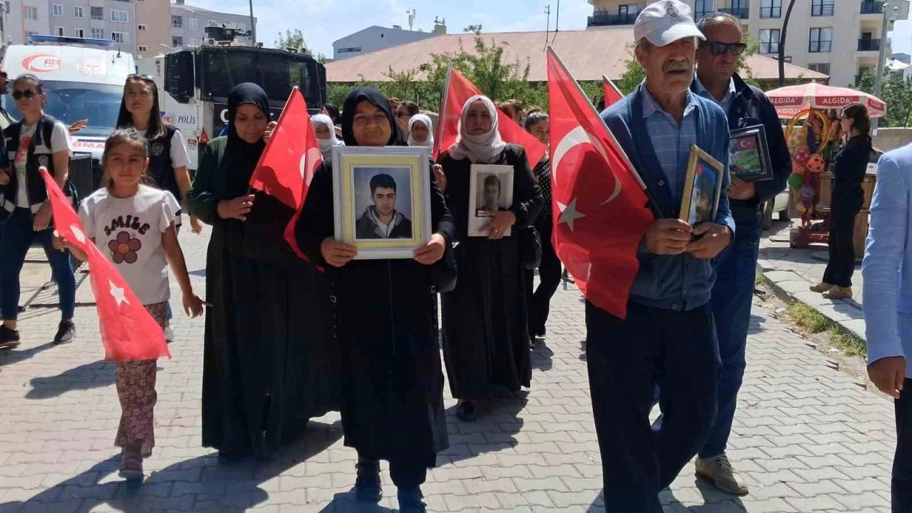Terör örgütü PKK tarafından çocukları dağa kaçırılan ailelerin başlattığı evlat nöbeti bu hafta da devam etti. Çocukları farklı tarihlerde terör örgütü PKK tarafından kaçırılan 35 aile, ellerinde Türk bayraklarıyla DEM Parti Van İl Başkanlığı binasına yürüyerek burada açıklamalarda bulundu.