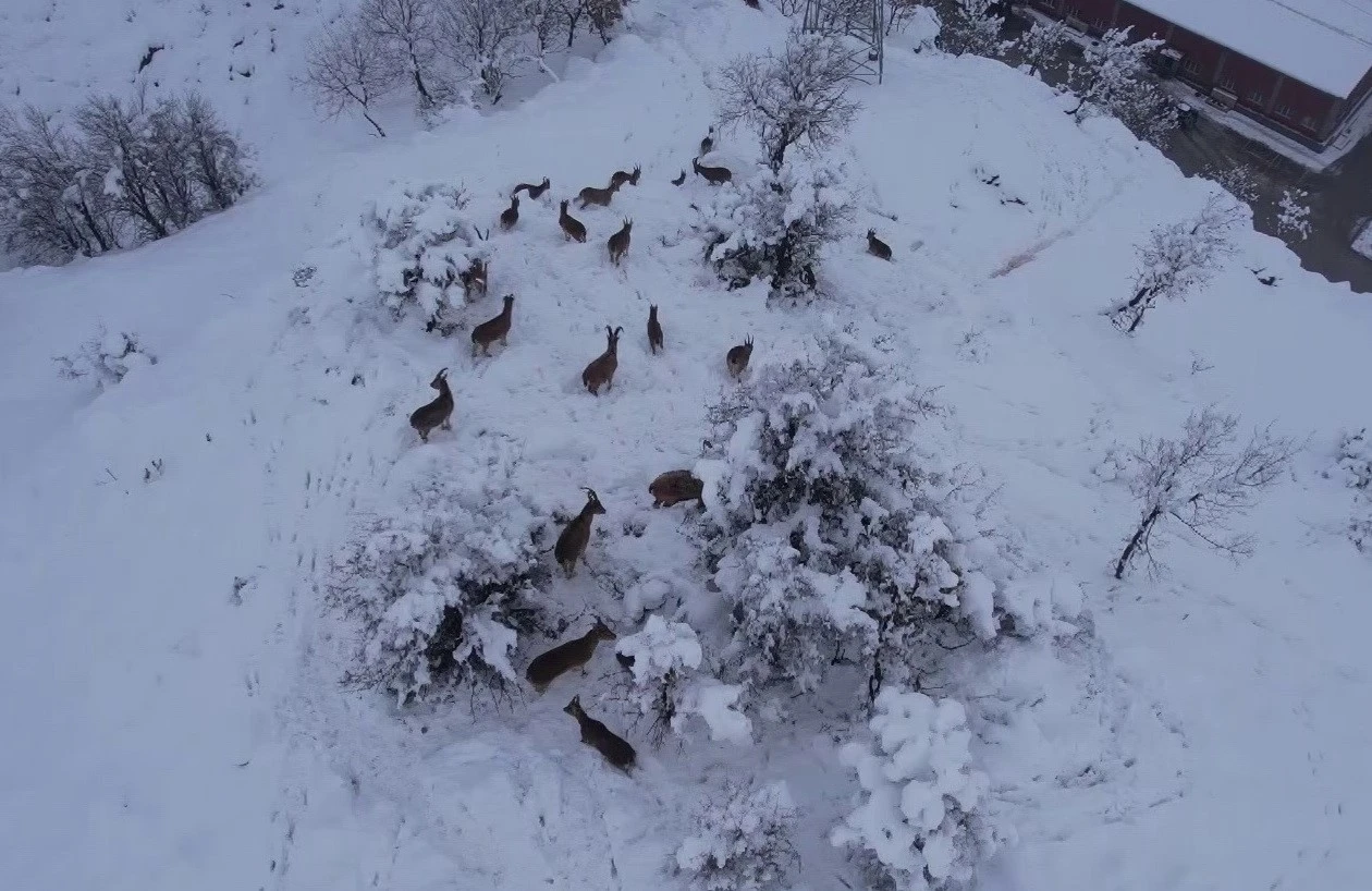 Kar nedeniyle zaman zaman karayollarına kadar inen yaban keçileri, kırsal bölgelerde yer alan maden ocaklarının yakınlarına kadar geliyor. Onlarca yaban keçisi sürüsü kar üzerindeki yolculuğu dron ile görüntülendi.