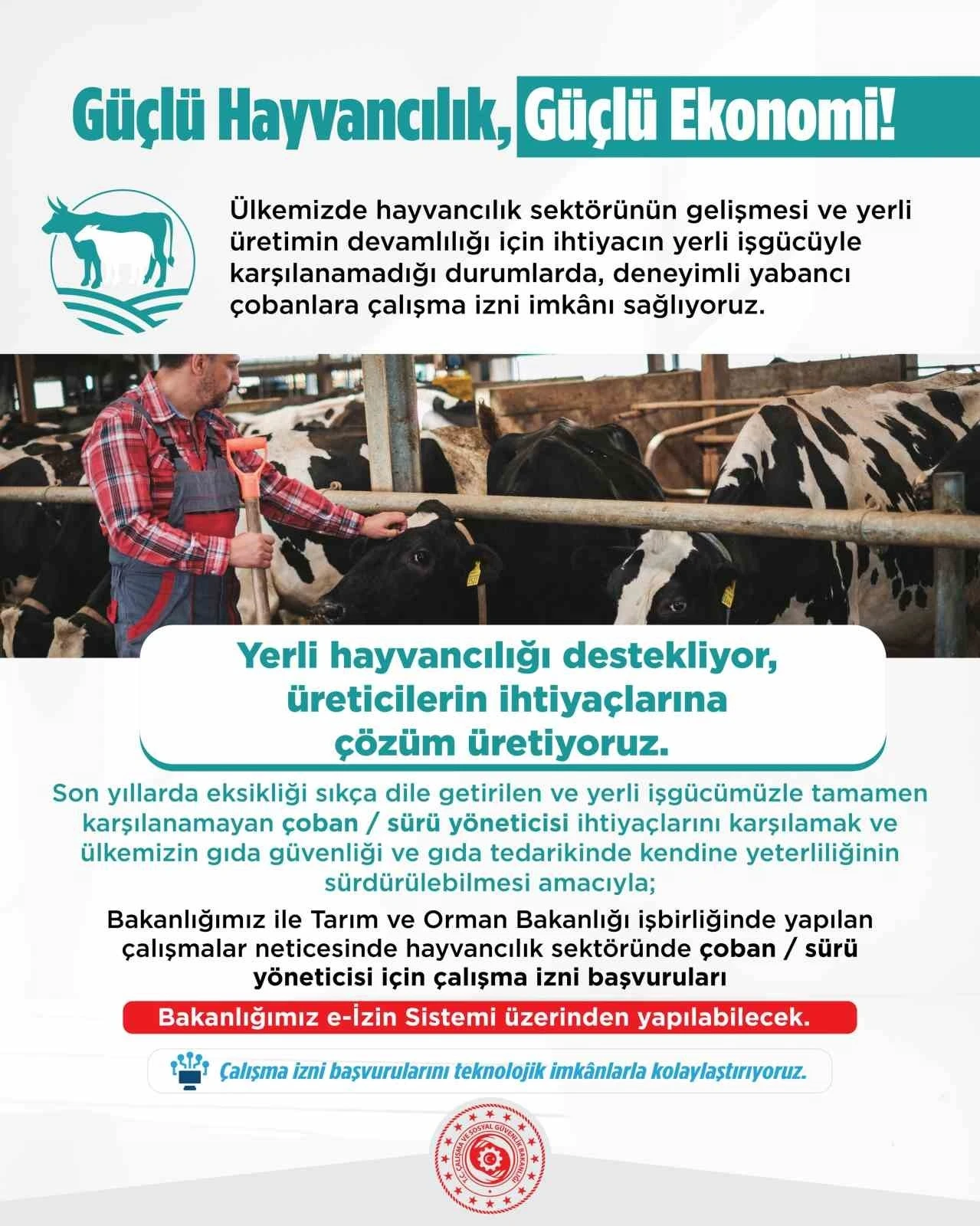 Açıklama çerçevesinde kapsamda Tarım ve Orman Bakanlığı işbirliğinde hayvancılık sektöründe büyükbaş veya küçükbaş hayvanı bulunan ve Hayvan Bilgi Sistemine kayıtlı hayvancılık işletmelerinde istihdam edilecek çobanlara ve hayvan bakıcılarına ilişkin çalışma izni başvurularının değerlendirilmesinde belirlenen kriterler kapsamında çalışma izni başvuruları 12 Hazinran tarihi itibarıyla alınmaya başlandığı belirtildi.