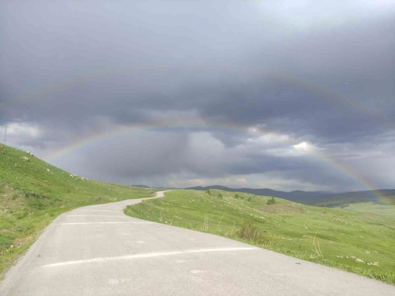 Ardahan’ın Göle ilçesinde etkili olan yağmur sonrası, gökyüzünde oluşan gökkuşağı görenleri hayran bıraktı.