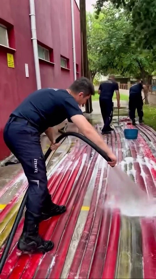 Bursa’da peş peşe çıkan orman yangınlarına itfaiye ekipleri günler süren müdahale sonrası kontrol altına aldı. Zorlu şartlar altında günlerdir alevlerle mücadele eden ekipler, görevlerinin ardından kullandıkları hortum ve ekipmanları detaylı şekilde temizledi. Yangın söndürme çalışmalarında yıpranan malzemelerin özenle yıkanması ve kontrol edilmesi, hem disiplinli çalışmanın hem de ekip ruhunun göstergesi oldu.