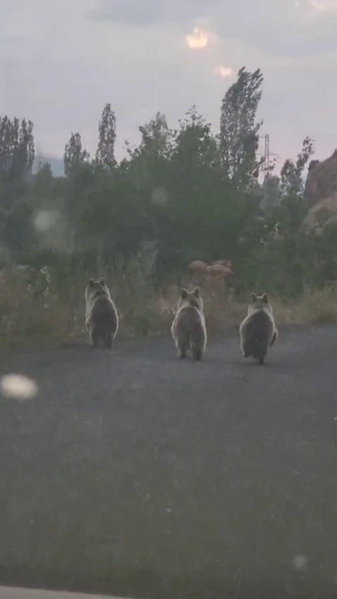 Şenkaya ilçesine bağlı Göreşken köyünde otomobille seyreder sürücü bir anda karşısında ayı ailesini gördü. 3 yavru ayı bir süre otomobilin önünde seyrettikten sonra gözden kayboldu.