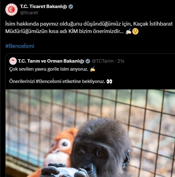 Ticaret Bakanlığının sosyal medya hesabından yapılan açıklamada, yavru gorile isim önerisine ilişkin, "İsim hakkında payımız olduğunu düşündüğümüz için, Kaçak İstihbarat Müdürlüğümüzün kısa adı KİM bizim önerimizdir" ifadesini kullandı.