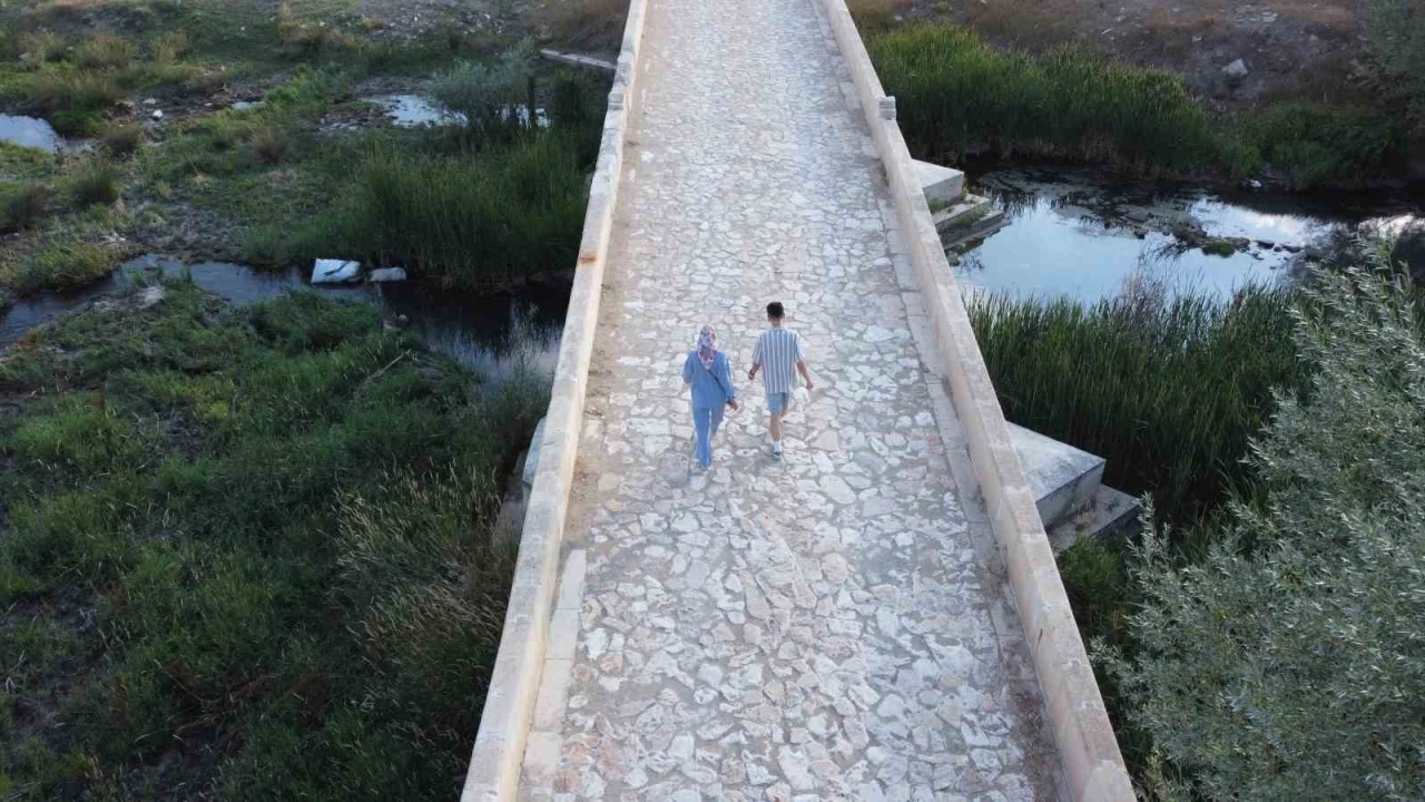 Yozgat’ta 2018 yılında aslına uygun restore edilen, aradan geçen beş asra rağmen varlığını korumaya devam eden Karabıyık Köprüsü, dronla görüntülendi.