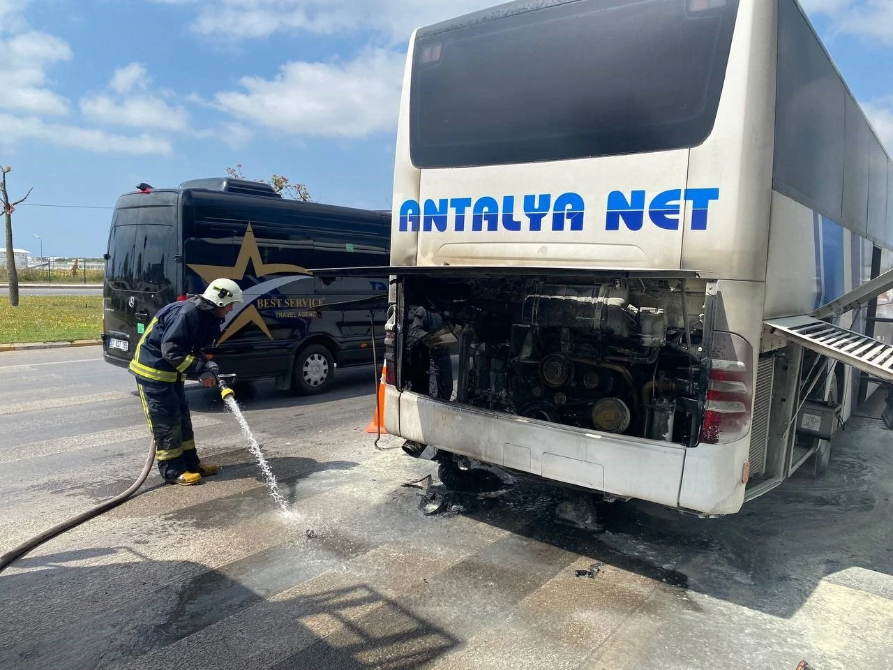 Antalya'nın Serik ilçesinde, D400 kara yolu Yukarı Kocayatak kavşağı yakınlarında öğle saatlerinde korku dolu anlar yaşandı. Alanya'dan İstanbul istikametine gitmekte olan Hüseyin D.'nin kullandığı 34 GMU 639 plakalı Antalya Net firmasına ait şehirlerarası yolcu otobüsünün motor bölümünde, ilk belirlemelere göre elektrik tesisatından kaynaklanan bir yangın çıktı.