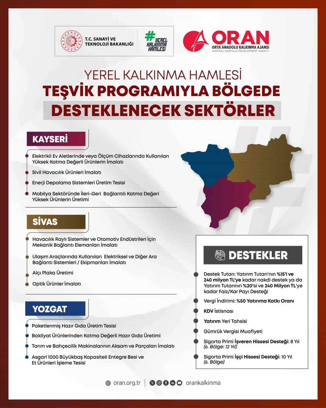 Sanayi ve Teknoloji Bakanlığı tarafından yürürlüğe konan Yerel Kalkınma Hamlesi Programı; Türkiye genelindeki 81 il için özel olarak belirlenen yatırım önceliklerini duyurdu. Programın usul ve esaslarını belirleyen tebliğ, 9 Temmuz 2025 tarihli ve 32566 sayılı Resmî Gazete’de yayımlandı. Program, iller arası gelişmişlik farklarını azaltmak, yerel potansiyelleri ekonomiye kazandırmak ve yüksek katma değerli üretimi teşvik etmek amacıyla hayata geçirildi. Her il için 4 sektörel başlık altında yatırım öncelikleri belirlendi. Kayseri, Sivas ve Yozgat için bu kapsamda illerin sahip olduğu üretim kabiliyetleri, insan kaynağı, altyapı ve potansiyel yatırım alanları dikkate alınarak belirlenen konular şu şekilde açıklandı; Kayseri için belirlenen 4 yatırım konusu: