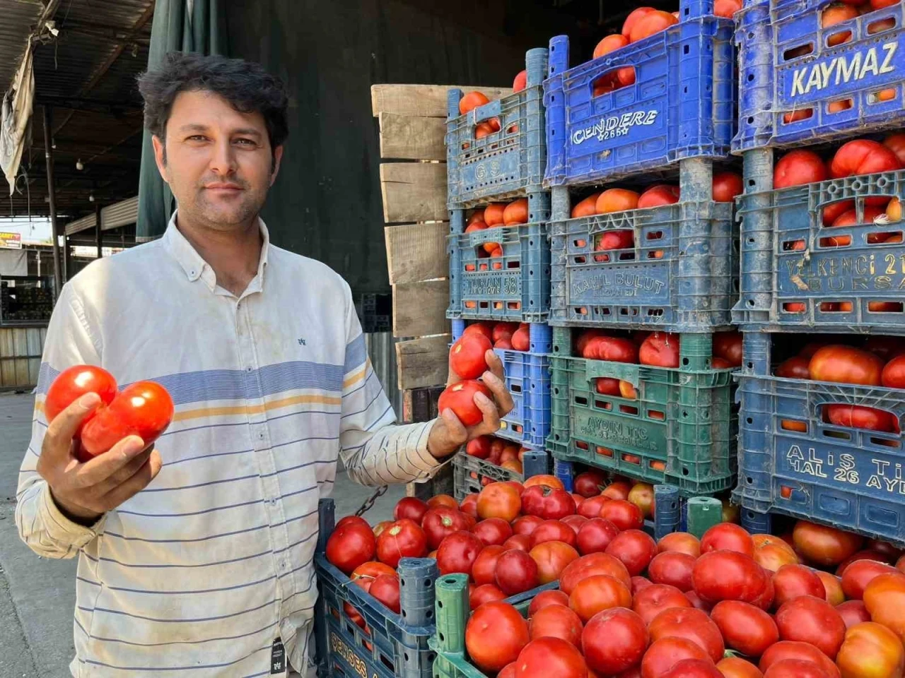 Domates üretici Yıldız, "2025 yılının ilk yerli domatesleri çıktı. Sabah erken saatte domatesleri topluyoruz. Bir römork domatesi, Acarlar haline getirdik. Domatesleri satışa sunduk. Yerli domateslerimiz çok lezzetli. Su problemimiz Allah’a şükür" dedi.
