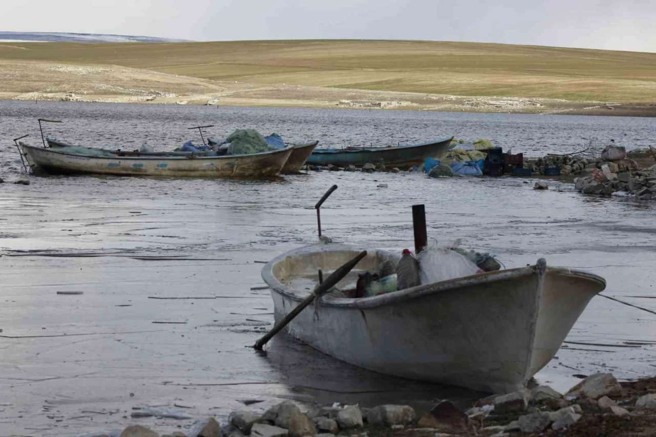 Yozgat’ta yüzeyi kısmen buz tutan Kanak Çayı üzerindeki Gelingüllü Barajı’nda balıkçı tekneleri kıyıda kaldı.