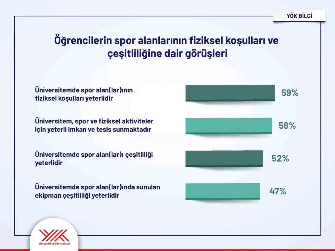 Öğrencilerin üniversitelerde spor alanlarını fiziksel şartları ve çeşitliliğine dair anket sonuçlarında ise öğrencilerin yüzde 59’u üniversitelerinde spor alanlarının fiziksel şartlarının yeterli olduğunu düşünüyor. Yüzde 58’i üniversitesinin spor ve fiziksel aktiviteler için yeterli imkan ve tesis sunduğunu belirtiyor. Öğrencilerin yüzde 52’si üniversitesinde spor alanları çeşitliliğinin yeterli olduğunu düşünürken yüzde 47’si ise üniversitelerde spor alanlarında sunulan ekipman çeşitliliğinin yeterli olduğunu ifade ediyor.