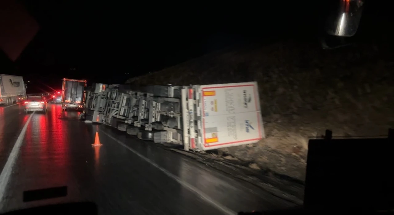 Hakkari’de karla karışık yağmur ve yoğun sisin etkili olduğu Yüksekova-Van karayolunda bir tır yan yattı.