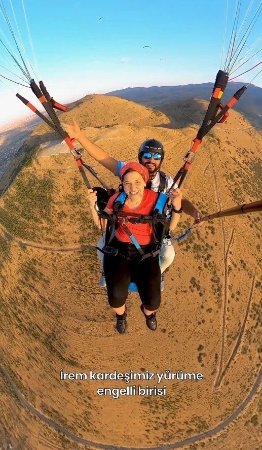 Kayseri’de yaşayan ve çocukluk çağında geçirdiği rahatsızlık sonucu yürüyemeyen 36 yaşındaki İrem’in paraşüte binme hayali gerçek oldu. Tekerlekli sandalyesi uçacağı alana gelen ve burada paraşüte binen İrem’i taşıyan paraşüt görevlilerin yardımıyla havalandı. Ali Dağı’ndan paraşüt pilotu Günay Demir ile gökyüzüne uçan İrem, heyecan dolu anlar yaşadı.