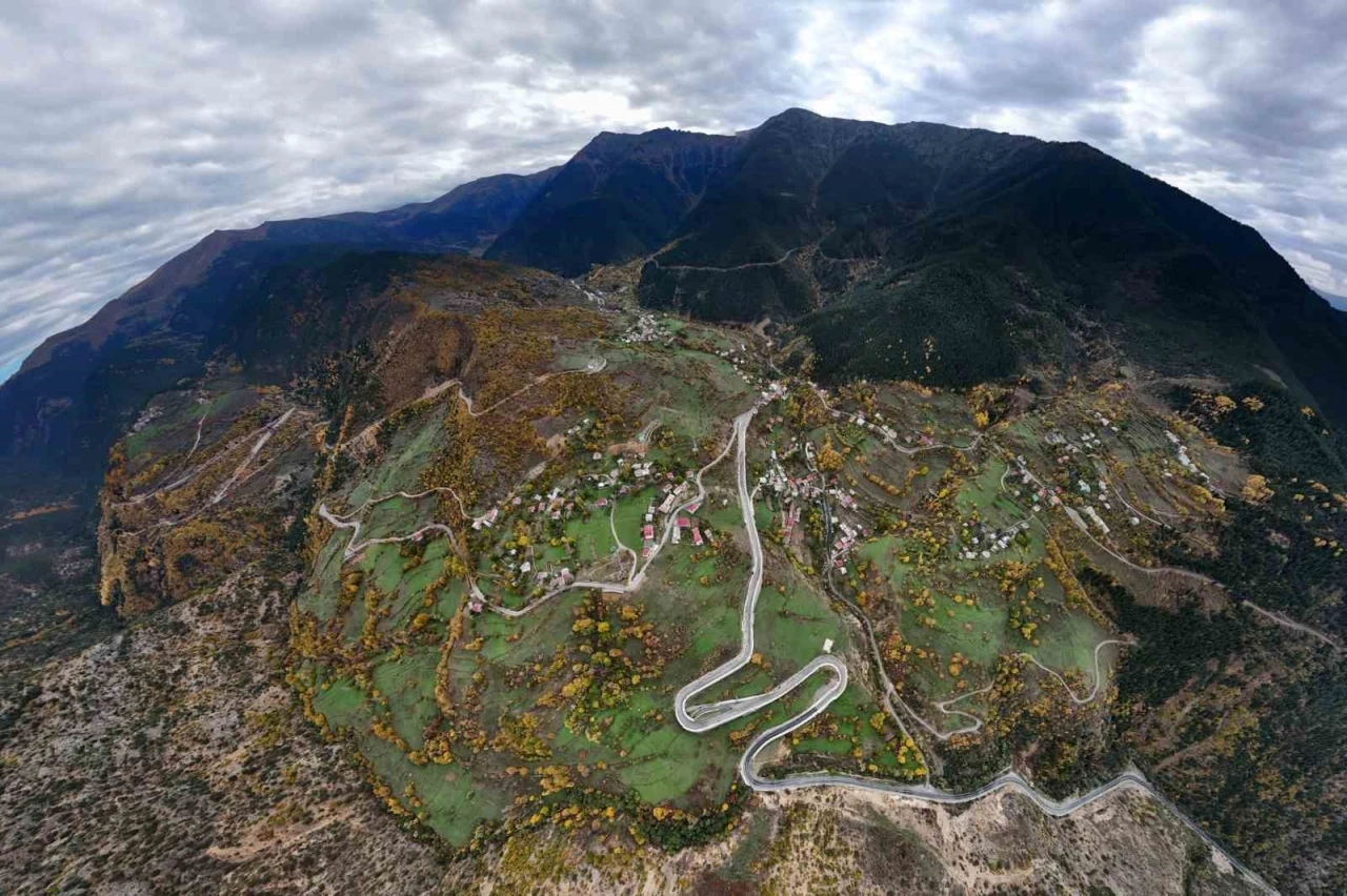 Gümüşhane’nin Torul ilçesindeki Zigana Dağı’nın yamaçlarına kurulu olan ve tarihi İpek Yolu güzergahında yer alan Zigana köyü, sonbaharın gelmesiyle birlikte adeta bir renk tuvaline dönüştü. Trabzon’dan Gümüşhane’ye doğru yola çıkan Mahmut ve Hande Bayrak çifti ise, bu manzarayı görebilmek için Zigana Tüneli yerine virajlı tarihi Zigana yolunu tercih etti.