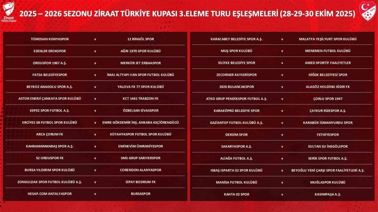 Ziraat Türkiye Kupası’nda 3. eleme turu maçları; 28-29-30 Ekim tarihlerinde oynanacak. Eşleşmelerde kazanan taraf, 4. tura yükselmeye hak kazanacak.