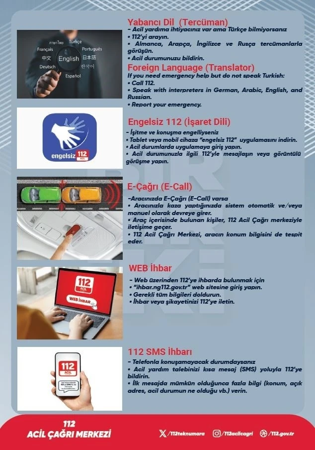 Ayrıca merkezin Türkçe haricinde İngilizce, Almanca, Arapça ve Rusça dillerinde de hizmet verdiği, personelin ise "Kriz Yönetimi, Mağdur Psikolojisi ve Temel Acil Çağrı Karşılama" gibi konularda düzenli eğitimlerden geçirildiği kaydedildi.